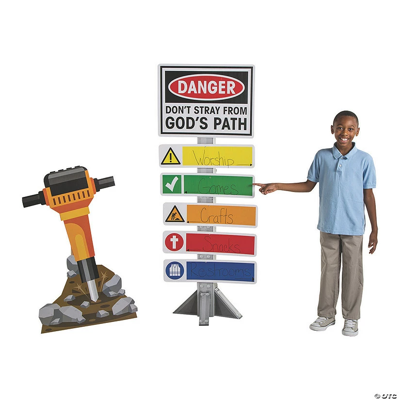 Danger! Donβt stray from Godβs path! Guide kids through your Construction VBS theme with fun VBS supplies likes this directional sign and jackhammer stand-up decoration! Use permanent markers to write on the signs to direct little VBS construction workers around the space, and display the jackhammer cutout with other construction-themed decor. Cardboard. (2 pcs. per set) Sign, 24″ x 66″; jackhammer, 29″ x 41″. Jackhammer stand-up is one-sided with a brown cardboard back. Simple assembly required. Β© OTC