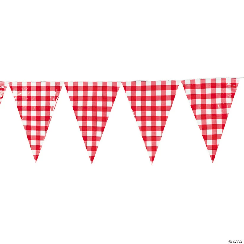 There’s nothing like giving summer BBQs, company picnics and family reunions some gingham to make them feel complete. This Large Red Gingham Pennant Banner is the perfect way to enhance your summer activities. Youโll love how much it adds to everything from decorating your party space to marking the finish line for races or obstacle courses. It also makes a great 4th of July decoration! Vinyl. 20″ x 28″ pennants hang from a 24 ft. banner. ยฉ OTC