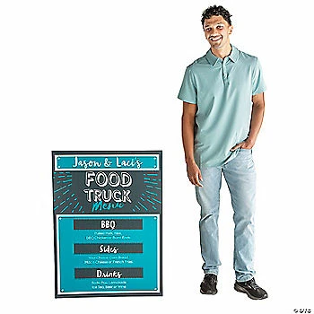 Get party guests excited about whatβs on the menu with this personalized sign. Similar to signs displayed outside food trucks, this sign can include menu items for your dinner party, wedding reception, fundraiser or, of course, an actual food truck event. Join the food truck craze with this personalized food truck sign! Cardboard. 27 1/2″ x 37 1/2″ Personalize with 10 lines of text. Simple assembly required. Β© OTC