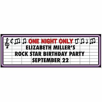 Announce your big event with a personalized banner! With a musical notes design, this rockin’ banner has the look of a concert hall marquee sign. Customize this banner with your own unique message, name or date! Vinyl. Includes adhesive tabs for hanging. ยฉย OTC