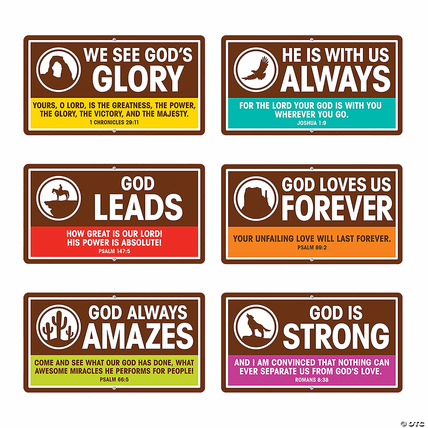 Give Southwest VBS kids faith-filled direction with these eye-catching cutouts. Designed to look like road signs, these cutouts each feature Southwest VBS messaging and images along with Scripture to support the idea that God is in charge. Add these wall decorations to your Southwest VBS walls to help fill the space with faith messaging! Cardstock. (6 pcs. per set) 20′ x 11″ © OTC