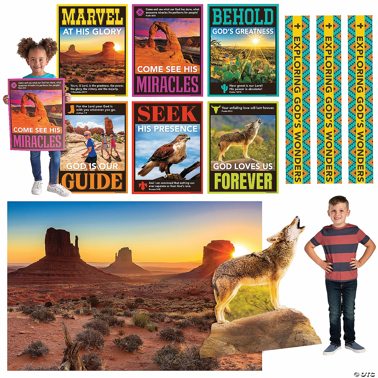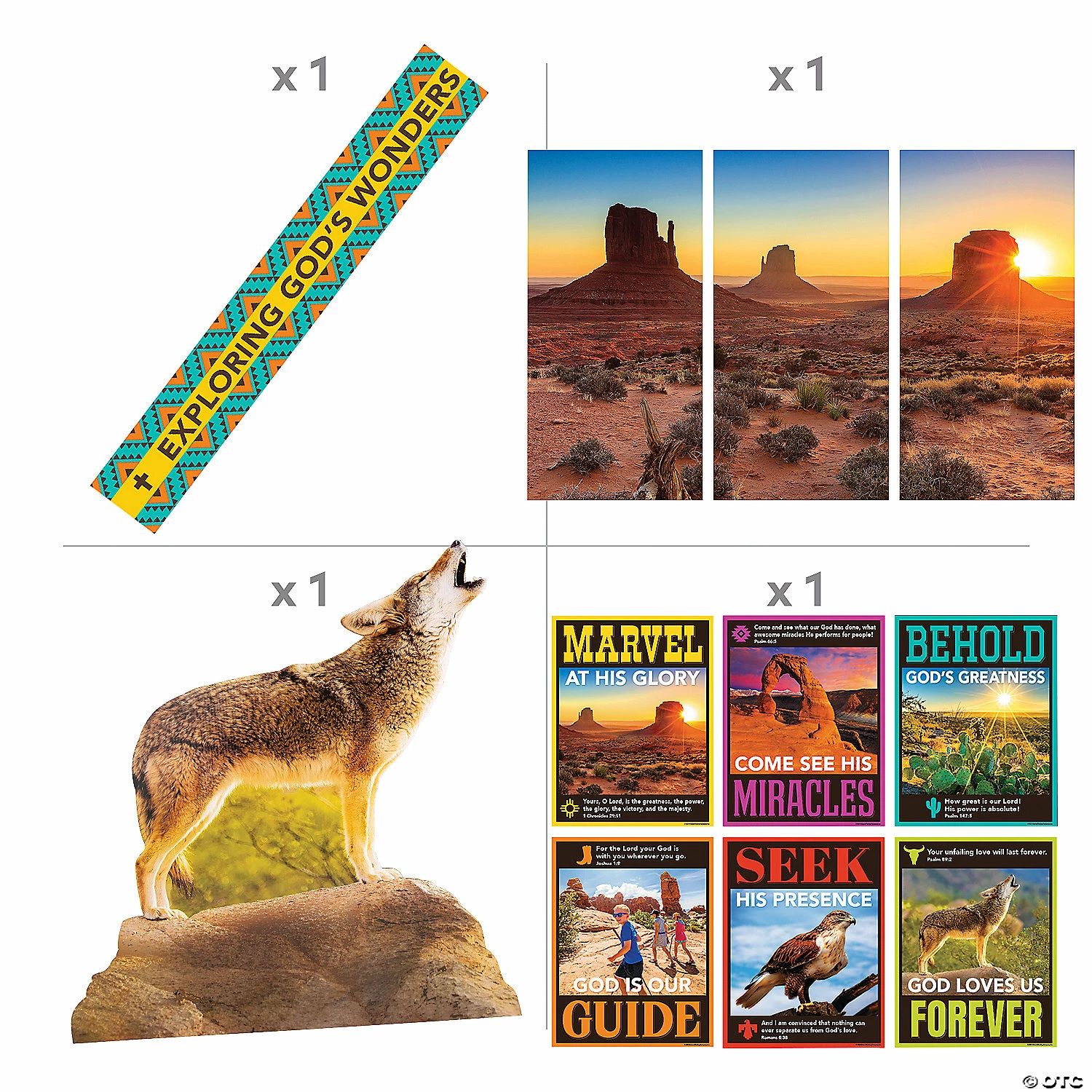 Explore dessert life from the comfort of your Vacation Bible School classroom. This Southwest VBS decorating kit helps students witness the beauty of Godโs creations, no matter where in the world you call home! Once your Vacation Bible School week is over, these sturdy decorations can be stored and re-used for other desert-themed lessons and events. (9 pcs. per unit)Includes:โข 1 Plastic Southwest VBS Monument Valley Backdrop (Assembled, 9 ft. x 6 ft. Simple assembly required.)โข 1 Plastic Southwest VBS Caution Tape (20 ft. x 4 1/2″)โข 1 Cardboard Southwest VBS Coyote Stand-Up (39″ x 42″ Simple assembly required. Stand-ups are one-sided with a brown cardboard back.)โข 6 Cardstock Southwest VBS Posters (16″ x 20 3/4″)โข Assortments are subject to change at any time and may vary from picture shown. Substituted items will be similar in nature.